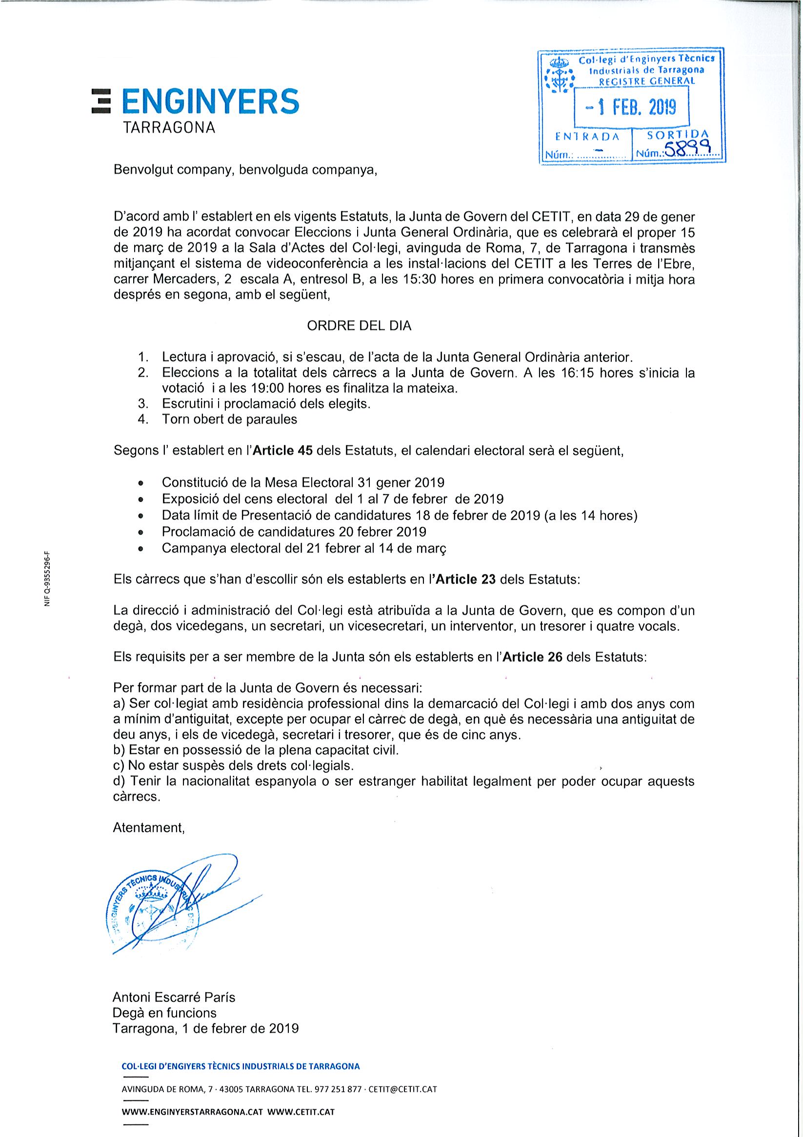 In accordance with the established in the current Statutes, the CETIT Government Board, on January 29, 2019, has agreed to convene Elections and Ordinary General Meeting, which will be held on March 15, 2019, Actas del Colegio, avenue de Roma, 7, of Tarragona and transmitted through the videoconferencing system at the CETIT facilities in Terres de l'Ebre, Mercaders street, 2 stairway A, mezzanine B, at 15: 30 hours in first call and half an hour later in second, with the following
